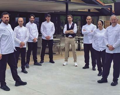 Eguzkiñe Gezuraga (ezker) eta Omer Amarika (eskuin) Binkekideak Basoa jatetxeko Gaizka Sainzekin, jasoko dituzten bina jatorduen berri jasotzeko unean.