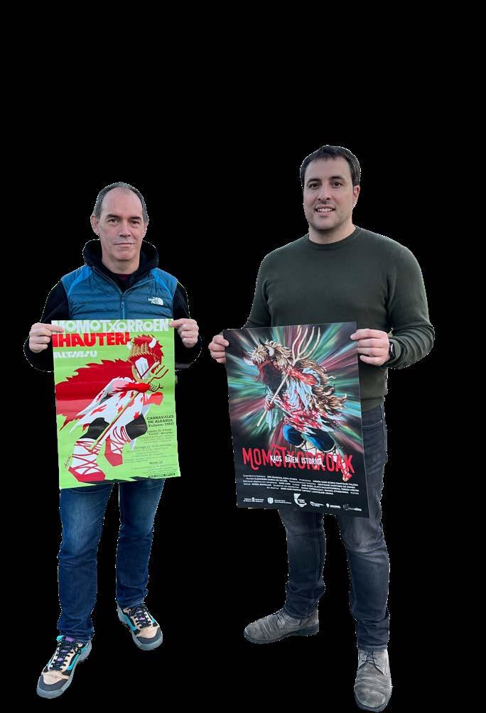 Kepa Otaegik (ezkerrean) duen kartela Altsasun inauteriak lehen aldiz 1982an egin zirenekoa da. Eguskizak aldiz, dokumentala iragartzeko kartela du eskuetan, aurrekoaren diseinuan oinarritutakoa.