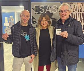 Asier Atxutegi eta Xabier Valencia Binkekideak Edurne Espilla zinegotziarekin, Udalak ‘Transition Resonances’ obraz gozatzeko oparitutako sarrerak jasotzeko unean.