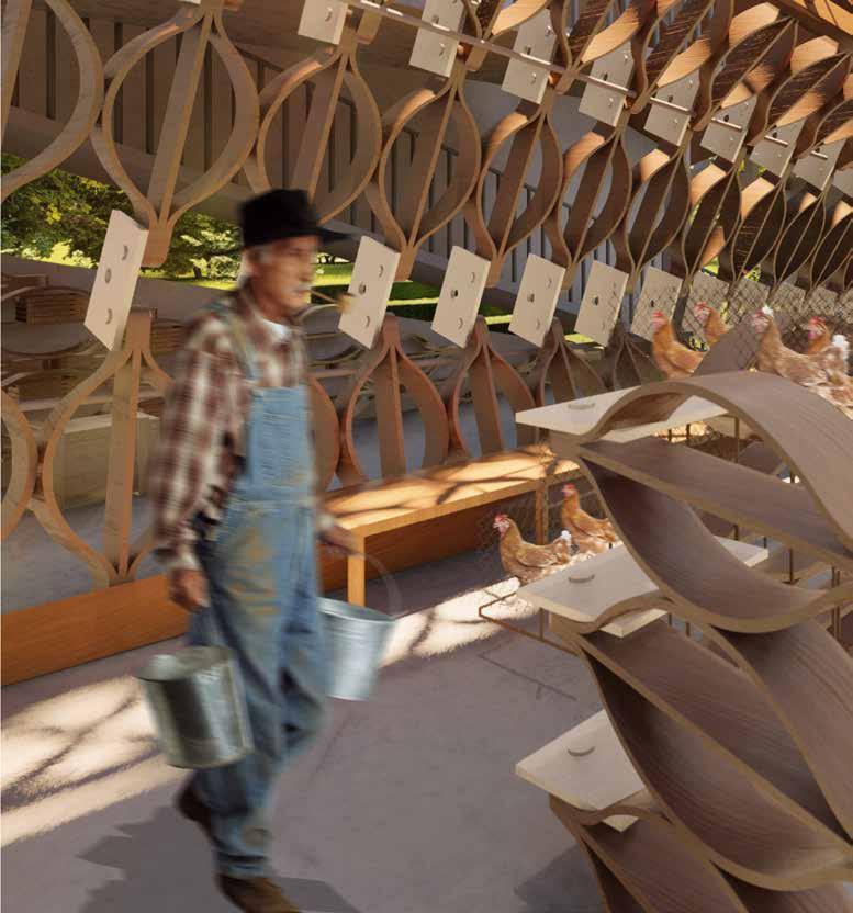 Kranji Aji emerges as an architectural innovation, coming forth in form of a chicken farm made of bending woods-based modular structure that can move dinamically thanks to their pinned joint connections. This design facilitates the implementation of business to consumers (B2C) market basis that shortens the commerce chain between the producer and the consumer, pushing the price while maintaining the commodities' quality.