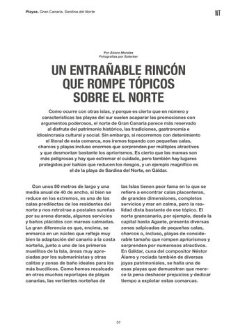 UN ENTRAÑABLE RINCÓN QUE ROMPE TÓPICOS SOBRE EL NORTE Como ocurre con otras islas, y porque es cierto que en número y características las playas del sur suelen acaparar las promociones con argumentos poderosos, el norte de Gran Canaria parece más reservado al disfrute del patrimonio histórico, las tradiciones, gastronomía e idiosincrasia cultural y social. Sin embargo, si recorremos con detenimiento el litoral de esta comarca, nos iremos topando con pequeñas calas, charcos y playas incluso enormes que sorprenden por múltiples atractivos y que desmontan bastante los apriorismos. Es cierto que las mareas son más peligrosas y hay que extremar el cuidado, pero también hay lugares protegidos por bahías que reducen los riesgos, y un ejemplo magnífico es el de la playa de Sardina del Norte, en Gáldar. las Islas tienen peor fama en lo que se refiere a encontrar calas placenteras, de grandes dimensiones, completos servicios y mar en calma, pero la realidad dista bastante de ese tópico. El norte grancanario, por ejemplo, desde la capital hasta Agaete, presenta diversas zonas salpicadas de pequeñas calas, charcos o, incluso, playas de considerable tamaño que rompen apriorismos y sorprenden por numerosos atractivos. En Gáldar, cuna del compositor Néstor Álamo y rociada también de diversas joyas patrimoniales, se halla una de esas playas que demuestran que merece la pena deshacer prejuicios y dedicar tiempo a explotar estas comarcas.