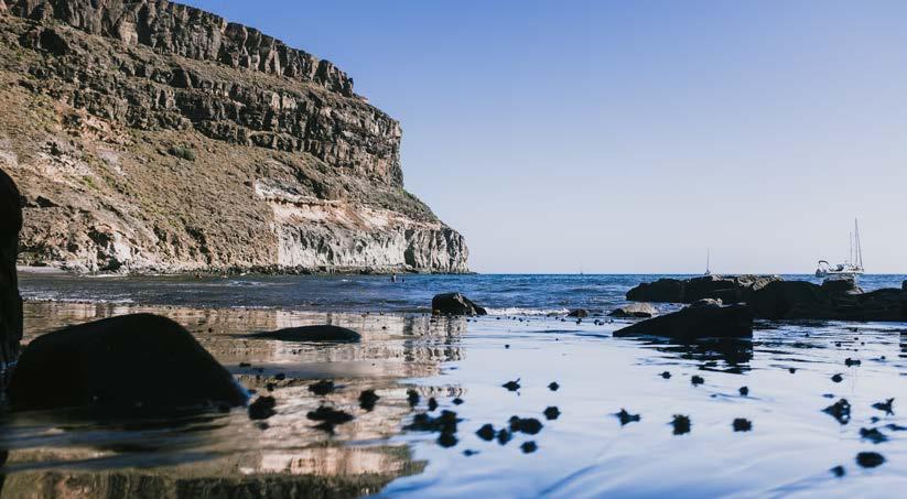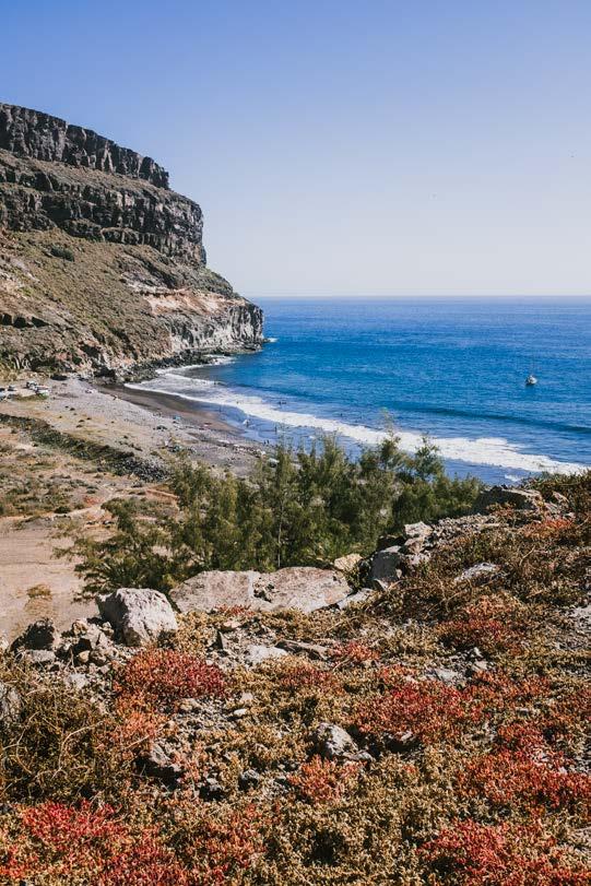 La planicie se abre como un embudo y una veintena de coches se aparcan a un lado mientras los antiguos caserones del siglo pasado permanecen en pie. Bajo la sombra de una camper están Mari Carmen y Miguel Ángel, oriundos de los municipios de Telde y Valsequillo. A pesar de las casi dos horas de camino, «es incomparable la tranquilidad que hay aquí», dicen, y quien está encantada de salir de paseo es Trufa, su perra de brillante pelaje negro. La marea está baja y los visitantes, la mayoría familias que se conocen de antaño, colocan sus sombrillas entre los cantos y van rápido a refrescar los pies en la arena que besa el oceáno Atlántico. A lo lejos, el horizonte está cubierto por las sábanas blancas de los veleros que vienen desde Pasito Blanco y Puerto de Mogán. La corriente es brava en el interior, pero las olas que recorren los casi cuatrocientos metros de largo de orilla son mansas.