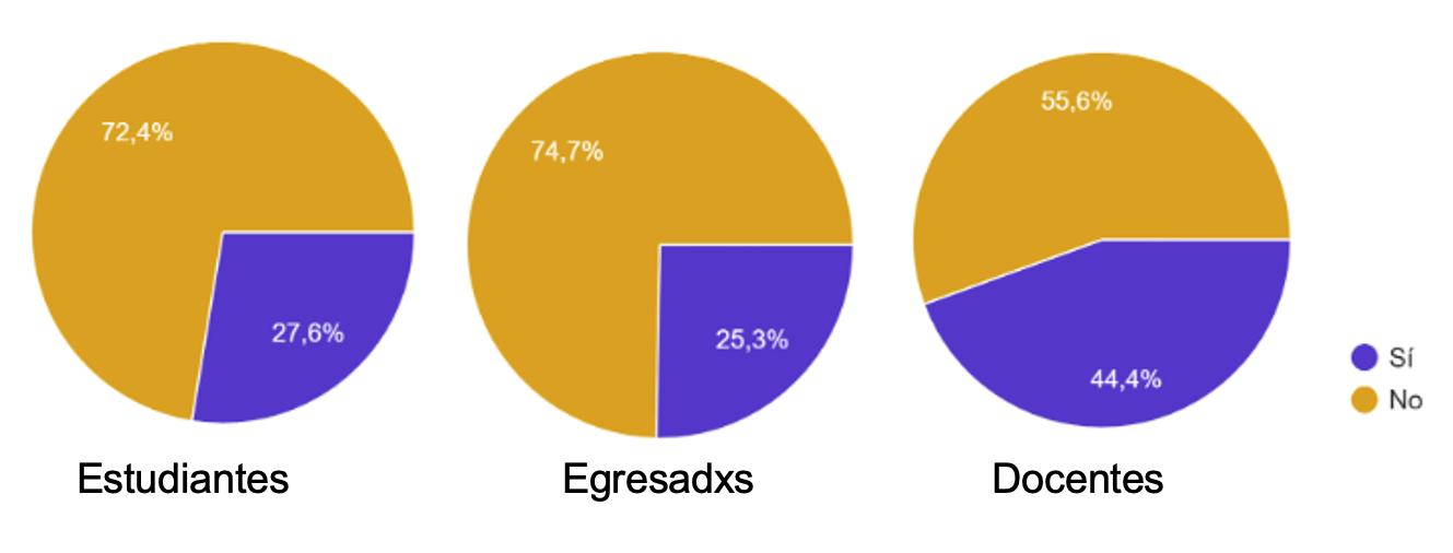 Esta pregunta fue planteada de forma abierta a los tres grupos encuestados. En primer lugar, entre les estudiantes una gran parte (62%) considera que sí es necesario que los docentes sean antropólogues físicos de formación, mientras que quienes respondieron que no (31%) también plantean que igualmente deben conocer el rubro antropológico y que la incorporación de otras disciplinas enriquece la formación académica. En segundo lugar, entre les egresades el 81% respondió que sí ya que es fundamental el enfoque antropológico en la formación profesional, y que los docentes conozcan la realidad de la disciplina y se muevan desde esta hacia otras disciplinas, mientras que el 8% respondió que no es necesario pero que es importante la formación basada en la multidisciplinariedad ya que la entrada de otros profesionales enriquece la visión de las temáticas. En tercer lugar, entre los docentes encuestados el 55% respondió que sí es necesario