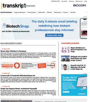 At the pulse of the industry: transkript de is the daily updated news and information portal for biotechnology and life sciences in the German-speaking countries of Europe The profound short reports focus on business, politics and science A wide range of service sections are also included As a fast, multifaceted information portal, transkript de is frequently used, creating the perfect environment for target group-specific online advertising