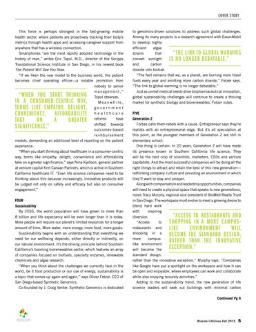 FIVE Generation Z Forbes calls them rebels with a cause. Entrepreneur says they’re realists with an entrepreneurial edge. But it’s all speculation at this point, as the youngest members of Generation Z are still in elementary school. One thing is certain: In 20 years, Generation Z will have made its presence known in Southern California life science. They will be the next crop of scientists, marketers, CEOs and venture capitalists. And the most successful companies will be doing all the right things to attract and retain the best of this new generation— rethinking company culture and providing an environment in which they’ll want to stay and prosper. Along with compensation and leadership opportunities, companies will need to create a physical space that speaks to new generations, notes Tracy Murphy, regional vice president of BioMed Realty Trust in San Diego. The workspace must evolve to meet a growing desire to blend hard work with inspiring diversion. “Access to restaurants and shopping in a more campuslike environment will become the standard design, rather than the innovative exception,” Murphy says. “Companies like Google have put a spotlight on the workspace and how it can be open and enjoyable, where employees can work and collaborate while also enjoying leisurely activities.” Adding to the sustainability trend, the new generation of life science leaders will seek out buildings with minimal carbon