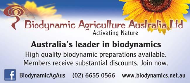 Biodynamic Agriculture Australia Ltd does not necessarily endorse the product or services being offered within advertisements in this magazine. Acceptance of advertisements is at the discretion of Biodynamic Agriculture Australia Ltd.
