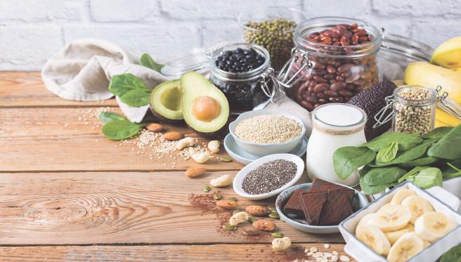 (avena, arroz, trigo sarraceno), hortalizas de hoja verde (espinacas, acelgas, col rizada), salvado de trigo, quinoa, cereales para el desayuno, chocolate negro, y algunos productos lácteos.
