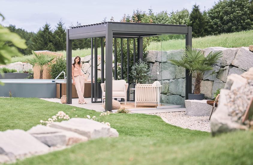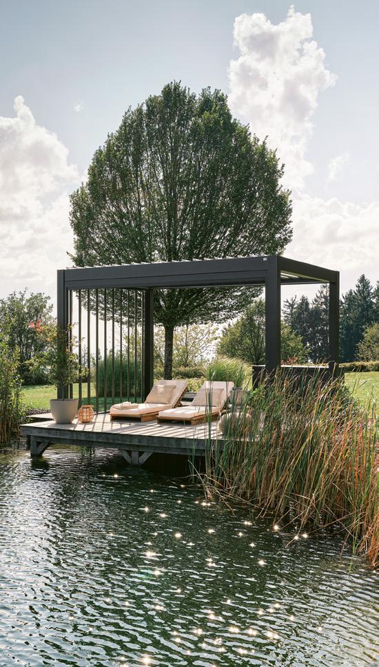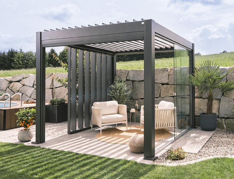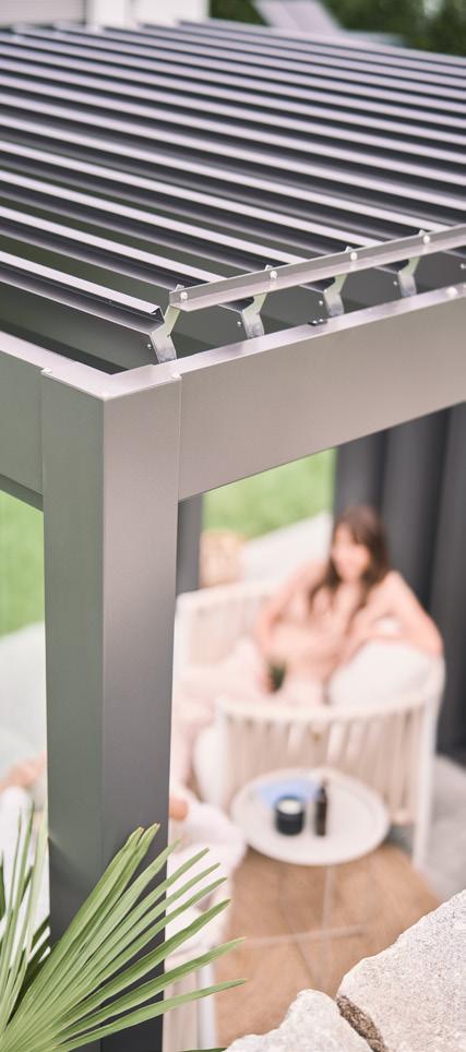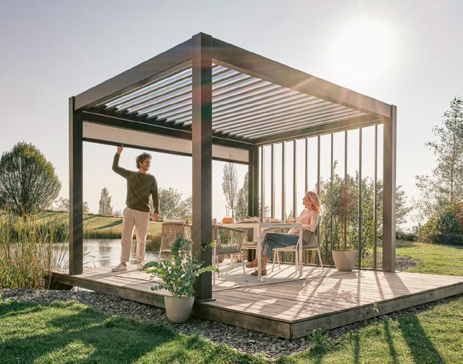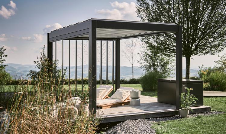 Hochwertig. Modern. Komfort bei jedem Wetter dank innovativer Sandwichbauweise für deutlich verminderte Geräuschkulisse und Wärmeabstrahlung vom Dach. Die Red Dot-prämierte Biohort Pergola gibt es bis zu 6 Meter Breite – selbst in den größten Ausführungen ohne Mittelsteher. Das schafft eine offene, großzügige Raumwirkung mit maximaler Gestaltungsfreiheit. Dank des vielseitigen Zubehörsortiments kann die Pergola individuell an unterschiedliche Anforderungen für Sonnen-, Wind- und Wetterschutz angepasst werden.