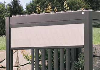 Zum Schutz vor Wind und Wetter. Die Lamellenseitenwand ist in den Größen 0,5 bis 4 m erhältlich und ermöglicht so eine flexible Gestaltung. Bei manueller Ausführung des Dachantriebs, kann die Lamellenseitenwand nicht auf der Seite mit der Kurbel montiert werden. Bei Verwendung von mehr als einer Lamellenseitenwand pro Pergola-Seite, muss zur Überprüfung der Realisierbarkeit der Produkt-Konfigurator herangezogen werden.