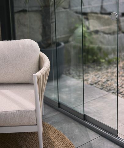 Die Glaselemente bestehen aus 10 mm starkem Sicherheitsglas und sind besonders stabil und bruchsicher. Durch die Rollenlagerung lassen sie sich leicht und angenehm bewegen. Ein sauberer Abschluss erfolgt in einer seitlichen Führung am Steher.