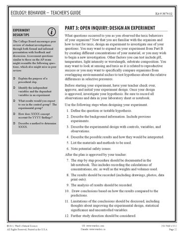 Ecology: Behavior – Teacher’s Guide EXPERIMENT DESIGN Tips The College Board encourages peer review of student investigations through both formal and informal presentation with feedback and discussion. Assessment questions similar to those on the AP exam might resemble the following questions, which also might arise in peer review: ‹ Explain the purpose of a procedural step. ‹ Identify the independent variables and the dependent variables in an experiment. ‹ What results would you expect to see in the control group? The experimental group? ‹ How does XXXX concept account for YYYY findings? ‹ Describe a method to determine XXXX.