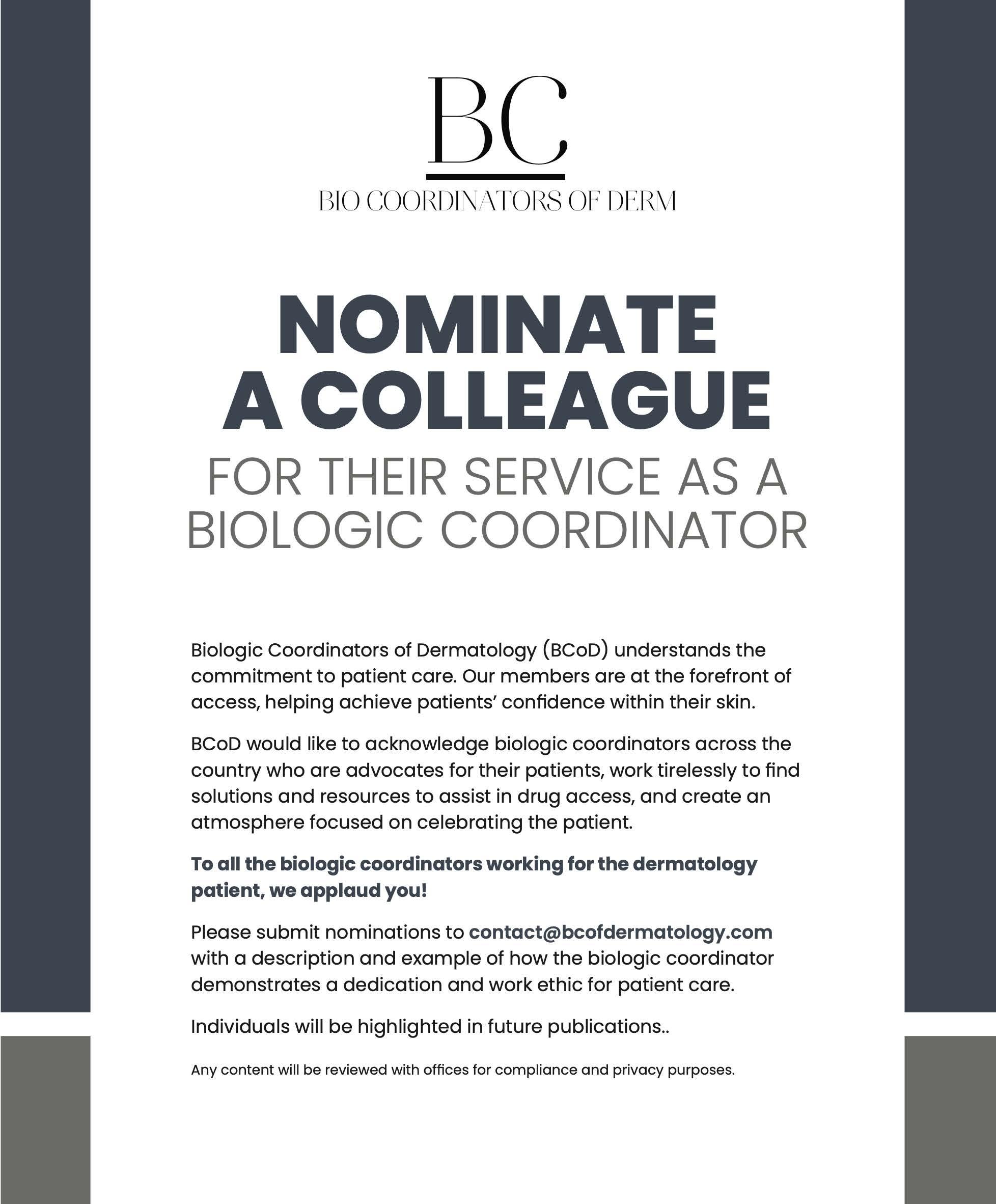 Biologic coordinators are champions who liaise with patients, payors, manufacturers, and specialty pharmacies to manage disease and process. Reach us at: contact@bcofdermatology.com to discuss partnering with ACCESS DERMATOLOGY on customized content to increase brand visibility and advance patient access.