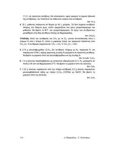11,2 L σε πρότυπες συνθήκες. Να υπολογίσετε, αφού γράψετε τη χηµική εξίσωση της αντίδρασης, την ποσότητα του αιθανικού νατρίου που αντέδρασε. Απ: 41 g 4. 20 L µεθανίου εισάγονται σε δοχείο µε 40 L χλωρίου. Τα δύο σώµατα αντιδρούν πλήρως στο διάχυτο φως, οπότε σχηµατίζεται ένα µόνο χλωροπαράγωγο του µεθανίου. Να βρείτε το Μ.Τ. του χλωροπαραγώγου. Οι όγκοι των αντιδρώντων µετρήθηκαν στις ίδιες συνθήκες πίεσης και θερµοκρασίας. Απ: CH2Cl2 Υπόδειξη: Κατά την αντίδραση του CH4 µε το Cl2, γίνεται αντικατάσταση έστω x ατόµων Η από x άτοµα Cl, οπότε ο µοριακός τύπος του οργανικού προϊόντος είναι CH4-xClx. Η αντίδραση παριστάνεται: CH4 + xCl2 CH4-xClx + xHCl