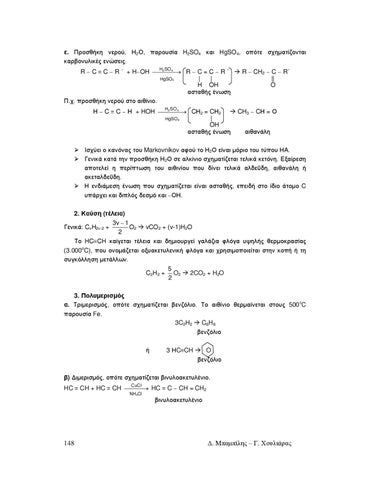 Ισχύει ο κανόνας του Markovnikov αφού το Η2Ο είναι µόριο του τύπου ΗΑ. Γενικά κατά την προσθήκη Η2Ο σε αλκίνιο σχηµατίζεται τελικά κετόνη. Εξαίρεση αποτελεί η περίπτωση του αιθινίου που δίνει τελικά αλδεΰδη, αιθανάλη ή ακεταλδεΰδη. Η ενδιάµεση ένωση που σχηµατίζεται είναι ασταθής, επειδή στο ίδιο άτοµο C υπάρχει και διπλός δεσµό και −ΟΗ. 2. Καύση (τέλεια) 3v − 1 Γενικά: CvH2v-2 + O2 vCO2 + (v-1)H2O 2 Το HC≡CH καίγεται τέλεια και δηµιουργεί γαλάζια φλόγα υψηλής θερµοκρασίας (3.000oC), που ονοµάζεται οξυακετυλενική φλόγα και χρησιµοποιείται στην κοπή ή τη συγκόλληση µετάλλων. 5 C2H2 + O2 2CO2 + H2O 2 3. Πολυµερισµός α. Τριµερισµός, οπότε σχηµατίζεται βενζόλιο. Το αιθίνιο θερµαίνεται στους 500οC παρουσία Fe. 3C2H2 C6H6 βενζόλιο ή