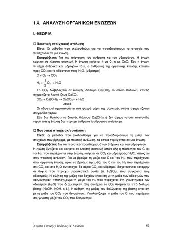1.4. ΑΝΑΛΥΣΗ ΟΡΓΑΝΙΚΩΝ ΕΝΩΣΕΩΝ Ι. ΘΕΩΡΙΑ Ποιοτική στοιχειακή ανάλυση Είναι: Οι µέθοδοι που ακολουθούµε για να προσδιορίσουµε τα στοιχεία που περιέχονται σε µία ένωση. Εφαρµόζεται: Για την ανίχνευση του άνθρακα και του υδρογόνου. Η ένωση καίγεται σε κλειστή συσκευή. Η ένωση καίγεται ή µε Ο2 ή µε CuO. Εάν η ένωση περιέχει άνθρακα και υδρογόνο τότε, ο άνθρακας της οργανικής ένωσης καίγεται προς CO2 και το υδρογόνο προς H2O. (υδρατµοί) C + O2 → CO2 H2 +