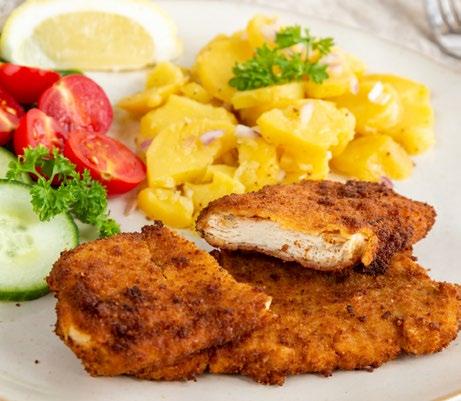 Außen knusprig gebraten, innen zart, saftig und aromatisch –ein Klassiker, der sowohl heiß als auch kalt schmeckt. Ganz wichtig für den Erfolg: den Frosti-Tofu zuerst etwas ausdrücken, dann saugt er die würzige Marinade besonders gut auf. Durch das Panieren wird die Marinade im Tofu eingeschlossen, und das gebratene Frosti-Schnitzel bleibt saftig. Die klassische Beilage zum Schnitzel sind Kartoffelsalat (Rezept im Buch) und grüner Salat.