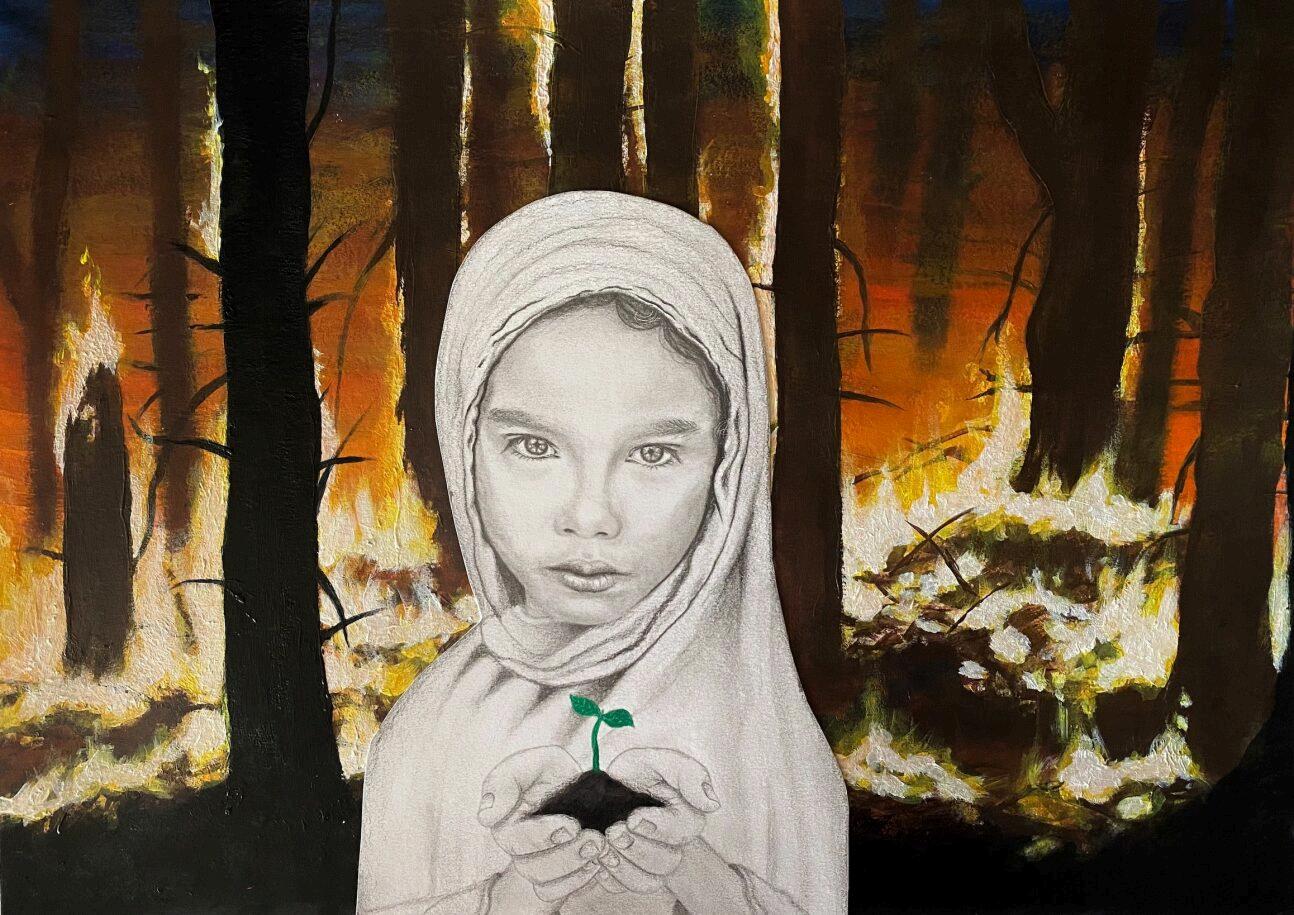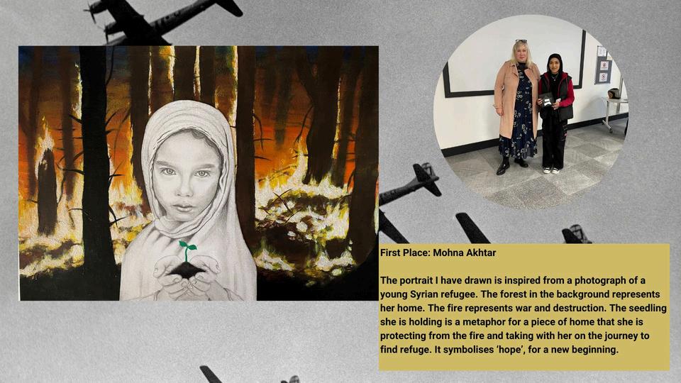 “The portrait I have drawn is inspired by a photograph of a young Syrian refugee. The forest in the background represents her home. The fire represents war and destruction. The seedling she is holding is a metaphor for a piece of home that she is protecting from the fire and taking with her on the journey to find refuge. It symbolises 'hope', for a new beginning.”