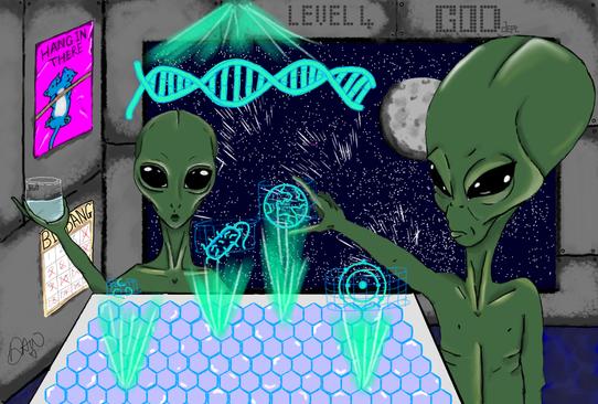 “An alternative take on the theory of creation but with a comedic twist! Two aliens designing Earth, prokaryotes, and the vital systems which life needs to grow and live. The two green men are shown working hard, perfecting their new planet down to the smallest atom. Hologram projectors are enabling them to zoom and spin their creations. The creations in question are cyanobacteria, which are known to be a green/blue algae, A double helix; to aid Earths life forms to mutate and evolve, a simple bacterium, an oxygen atom, and Earth itself. 'New beginnings' aren't just related to birth, new scientific research, or new life experiences, but from the beginning of the new planet 'Earth'.”