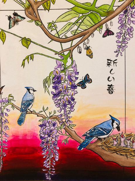“At the beginning of a new spring in a blossoming purple wisteria tree, the blue jay (Cyanocitta cristata) feeds its young hatchlings in its nest. From their cocoons, butterflies emerge to consume the nectar of the wisteria's cascading flowers.”
