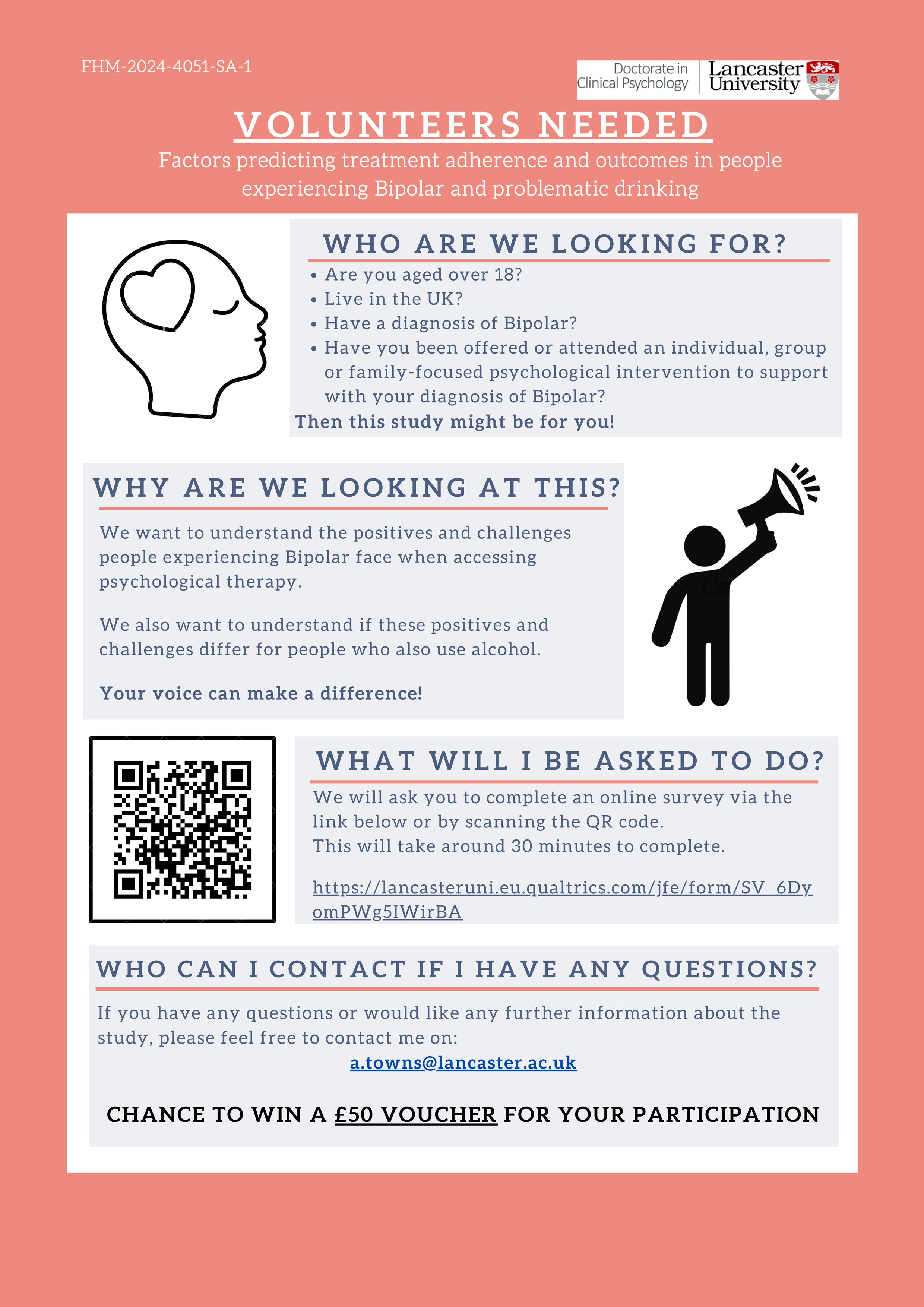 The questionnaire is for adults (aged 18 or over) with experience of care under one or more psychiatrist in Scotland in the last five years: https://fe3f3zzl3jq.typeform. com/to/YPYeuIzS