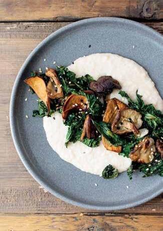 white bean puree with crispy kale and mushrooms