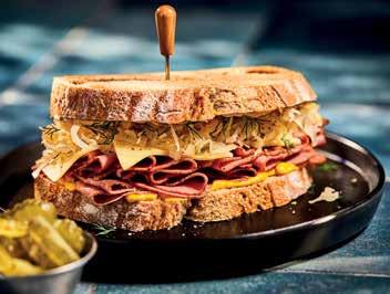 A timeless deli classic elevated with a homemade touch — this Reuben sandwich is the perfect harmony of rich, tangy and savoury. Layers of tender sliced pastrami or beef meet smooth, melting Swiss cheese, sharp American mustard and crisp gherkins, all nestled between slices of hearty rye bread.