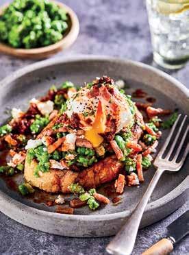 3. Spoon a generous amount of peas onto the toast and top with crumbled feta, a hot poached egg and a sprinkle of bacon lardons.