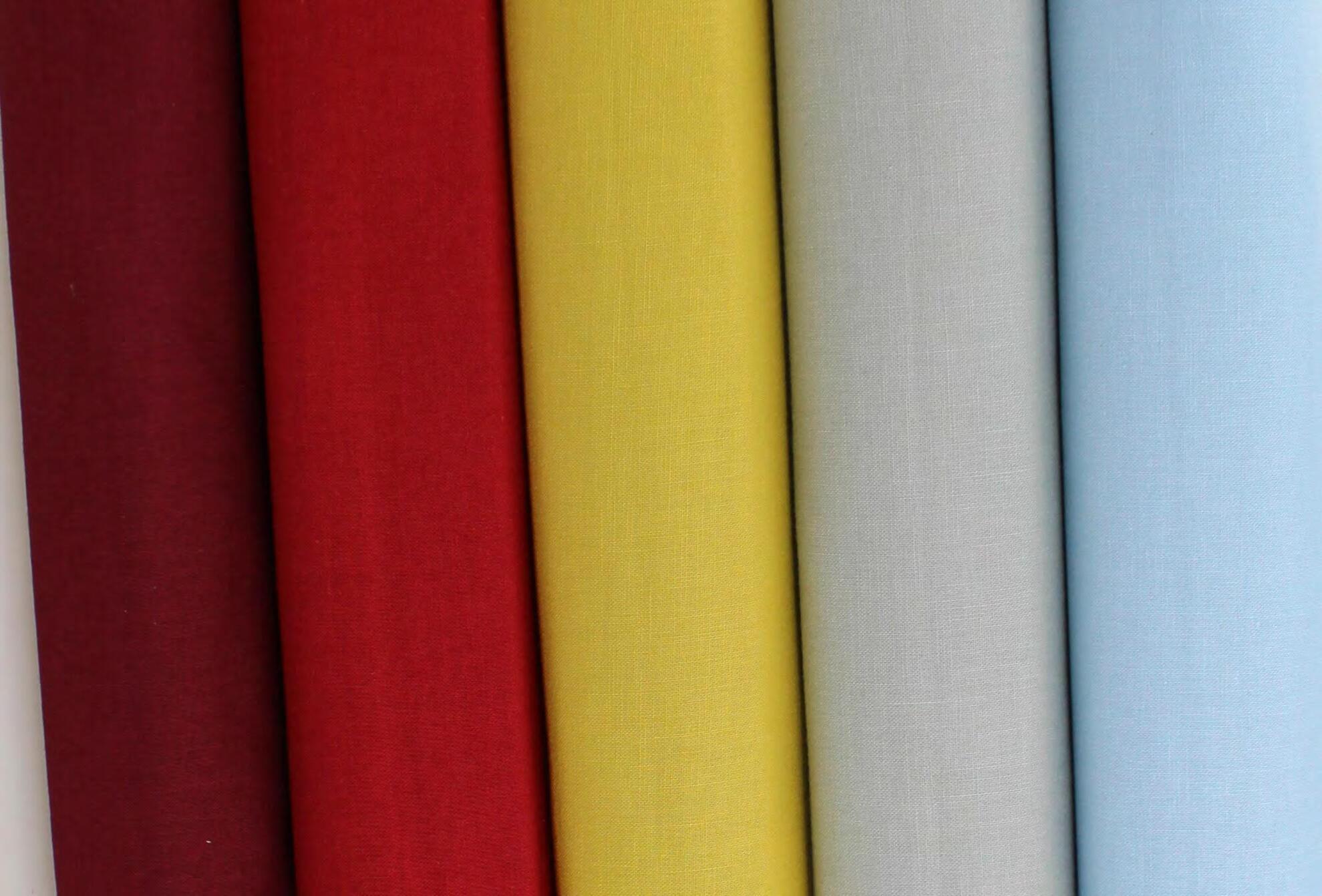 High quality solid colour fabrics suitable for all styles of quilting projets, clothing, apparel items, craftwork and more. There colours will coordinate with the wide range of designer cotton print fabrics. Available in 5 new solid colours.
