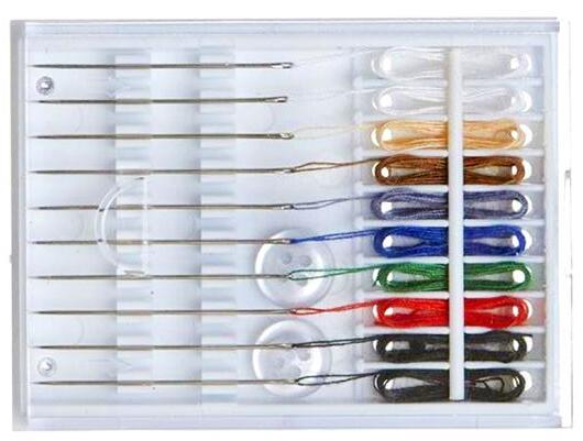 Kit Contains: Assorted threads, Thimble, Threader, Scissors, Needles, Pins, Safety pins, Tape measure, Buttons.