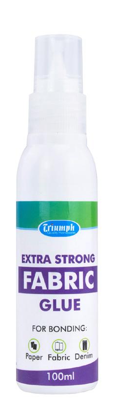 Fabric Glue is a wonderful alternative to sewing. Suitable for bonding fabric to fabric, denim, canvas, ribbon, cord, laces, trims, glitter, paper and more. Great mirror work, quilting and applique. It can be an alternative for mending clothes without a needle and thread. Dries clear. Non toxic.