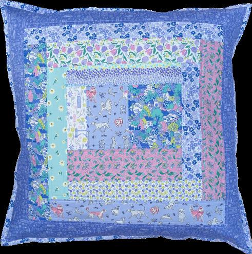 Join 2½” binding strips on diagonal. Place backing pieces on top of quilted cushion top with wrong sides facing overlapping hemmed edges of cushion back pieces. Stitch binding around the edges.