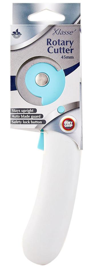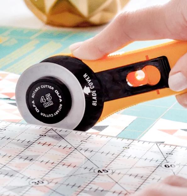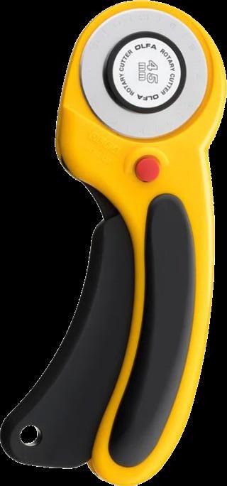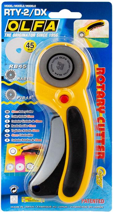 The 45mm is the best and most popular rotary cutter brought to you by OLFA known for simplicity and efficiency in fabric cutting Classically designed straight handle, comfortable in the right or left hand and perfect for cutting quilting shapes or strips. Slip the convenient blade guard into place in-between cuts added for safety. Textured grooves on either side of the handle allow for stable handling.