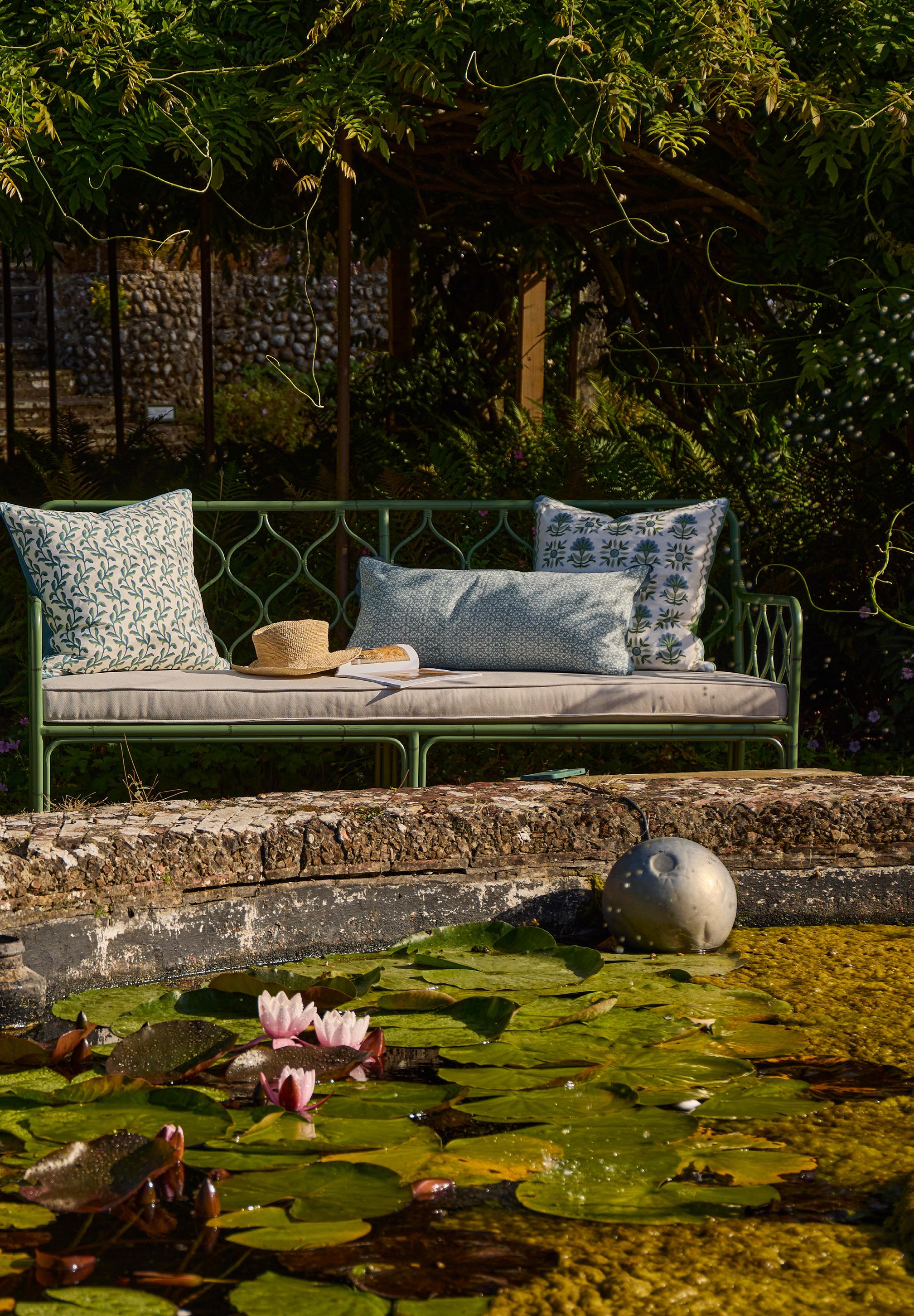 Our Arriate outdoor cushion is both smart and practical. Featuring a classic trellis pattern, block printed by hand in three colourways, Arriate is water-resistant and beautifully soft, perfect for garden seating.