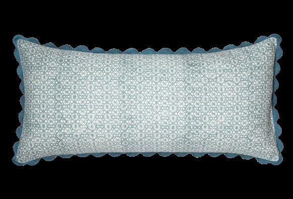 With a beautifully scalloped border, the design of our fun Teja cushions echoes the rooftops of old buildings in Cuba. This distinctive cushion is available in three colourways and block printed by hand on an off-white ground.