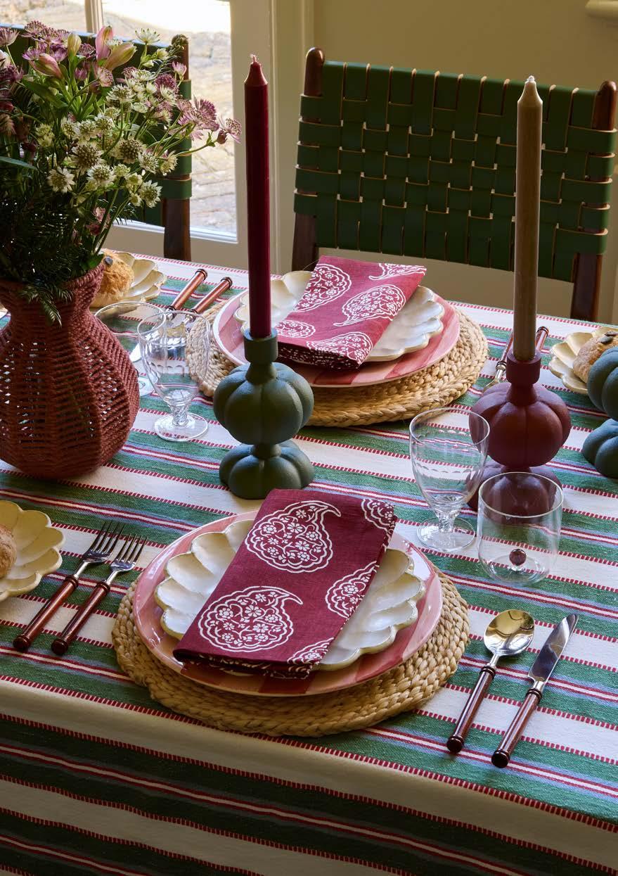 Our Autumn Winter dining collection has been designed and curated by Birdie to bring warmth, character and artisanal detail to any table setting. This season, we are delighted to introduce sculptural Pumpkin Candlesticks in rich, painted finishes, alongside an array of vases and woven seagrass trays. Printed Paisley napkins and tablecloths in bold seasonal tones complete the collection, offering an effortless way to add colour and texture to both everyday and occasion dining.