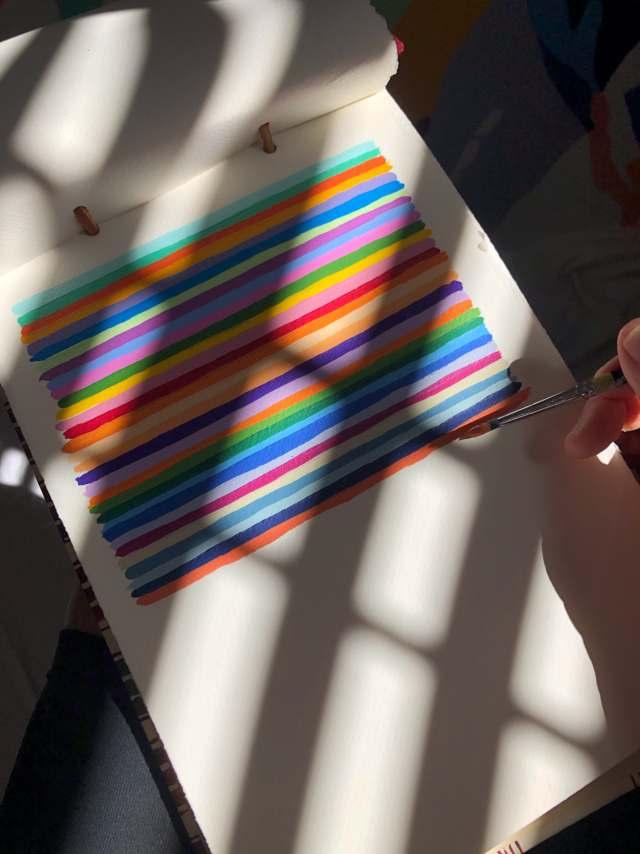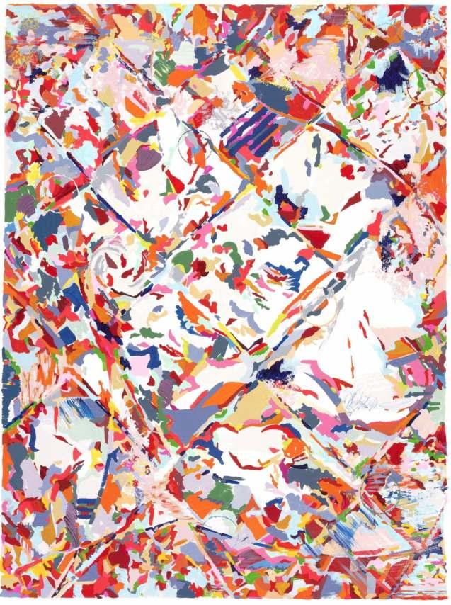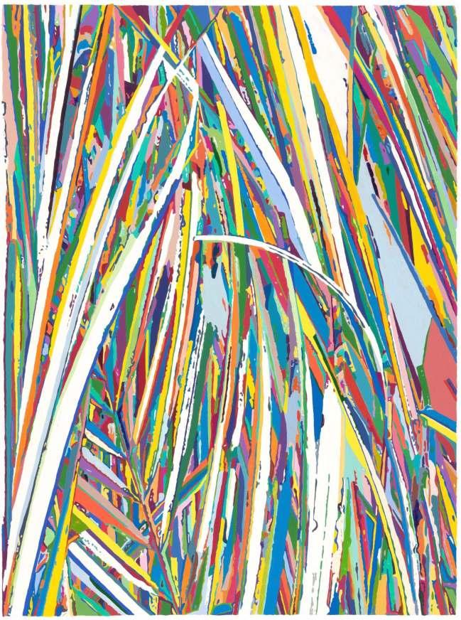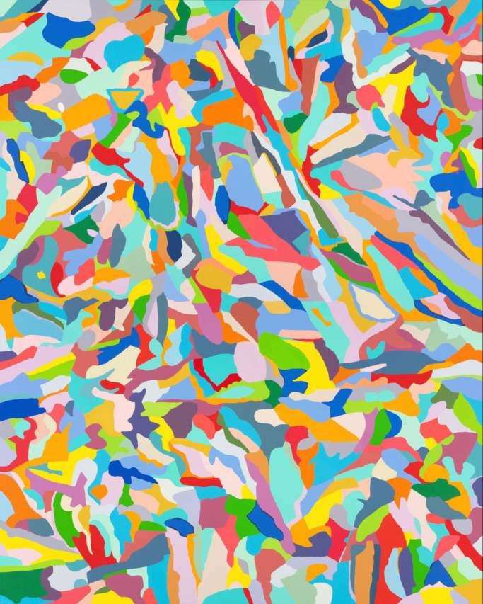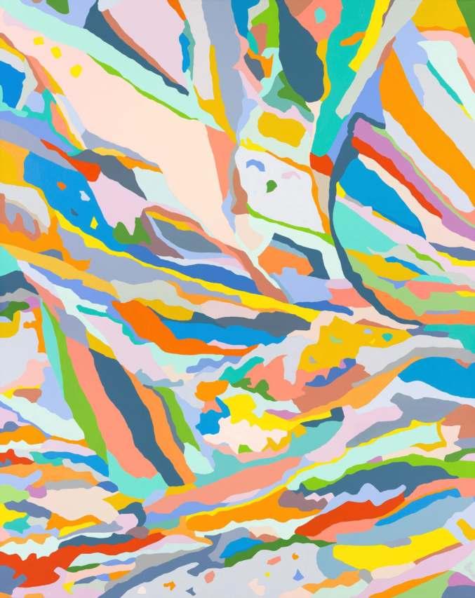 To create these storytelling puzzles, acrylic colors positioned side by side start to create entertaining surprises. An owl in sunglasses? Plane coming in for landing? Bird in a nest? Monk praying? Fish doing a backflip? I’ll let the viewer decide.