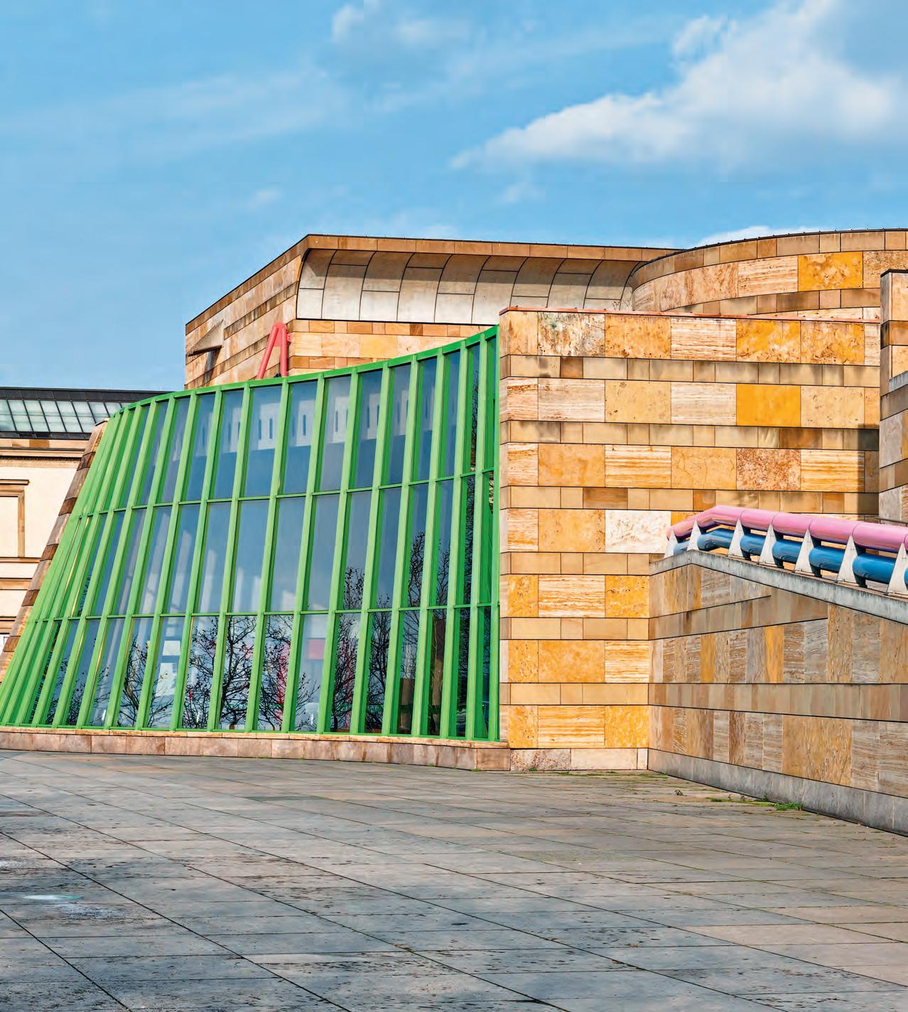 Für die Achtziger- und Neunzigerjahre steht die Denkmalpflege im Moment in der Frühphase der Schwellenobjekte, vulgo Schlüsselbauwerke und Ikonen. Meist steht der künstlerische Wert der Bauwerke im Vordergrund. Es sind die epochalen Bauwerke der alten Bundesrepublik mit großem Zeugniswert, die Ikonen wie etwa die Neue Staatsgalerie von James Stirling, Michael Wilford and Associates in Stuttgart (Abb. 1), die es schon auf die Titelblätter der Denkmalpflegeliteratur geschafft haben.5 Pointiert formuliert, wird in Stuttgart im 20. Jahrhundert zweimal europa-, vielleicht sogar weltweit Architekturgeschichte geschrieben: einmal 1927 mit der Weissenhofsiedlung und einmal 1984 mit der Neuen Staatsgalerie. Die Staatsgalerie, die als Bau für Kunst selbst zum Kunstwerk wird, hat Wolfgang Pehnt als „Fanal der Postmoderne“ gewürdigt.6 Die Neue Staatsgalerie wurde schon 1987, drei Jahre nach ihrer Fertigstellung, intern als Kulturdenkmal gesehen, 2005 dann offiziell unter Schutz gestellt und 2014 als Kulturdenkmal von besonderer Bedeutung geadelt. Die Denkmalgeschichte der Stuttgarter Kulturmeile wird 2018 fortgeschrieben: Auch die Staatliche Hochschule für Musik und Darstellende Kunst (1992–1996) und sogar das Haus der Geschichte Baden-Württemberg (2001) werden als Gesamtplanung Stirlings mit dem Motto „bottle and cork“ in die Denkmalliste aufgenommen.7 Die Stuttgarter Kulturmeile ist damit ein seltenes Gesamtkunstwerk der postmodernen Architektur und Stadtplanung, ein Exempel von internationalem Rang. Bei diesen Ikonen kann man es aber nicht belassen, will man eine Architekturepoche mit exemplarischen Objekten gewürdigt sehen. Es braucht weitere Objekte in erster und dann auch in zweiter Reihe, um diese wichtigen Jahre der BRD und der DDR sowie seit 1990 des wiedervereinigten Deutschland anschaulich im Bestand dokumentieren zu können. Mit der Neuen Staatsgalerie als fulminantem Auftakt folgte in den Achtzigerjahren eine ganze Reihe weiterer Bauten für Kunst und Kultur. Im Museums- und Galeriebau fand die postmoderne Architektur wohl zu ihrer reichsten motivischen Gestaltung. So leisteten sich – um weitere