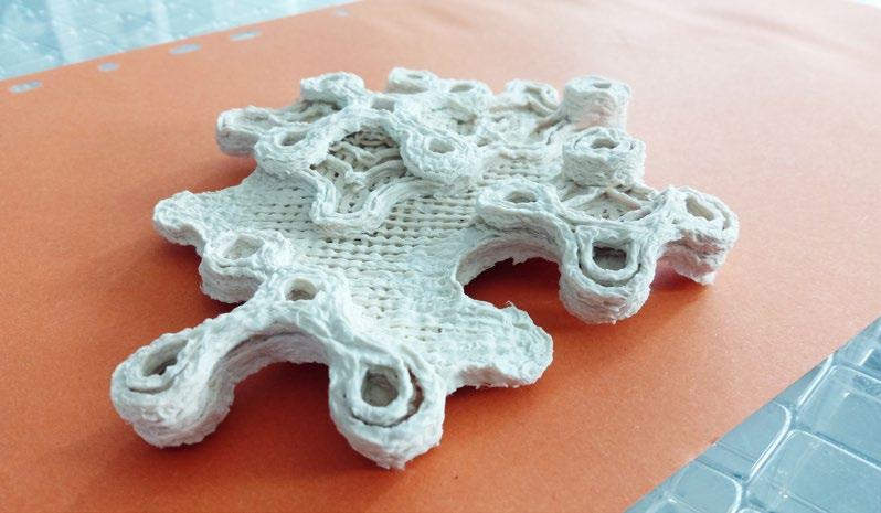 Joining techniques from the textile sector also lend themselves well to building with paper: since it is a flat material, textiles can better absorb tensile than compres sive forces » fig. 6. Corresponding solutions with seams, welting connections or bond ing are well conceivable and have development potential. Finally, the aspect of addi tive manufacturing should be pointed out. Volume-generating manufacturing processes that produce free-formed components from paper mass are conceivable, and initial additive manufacturing attempts are promising » fig. 7