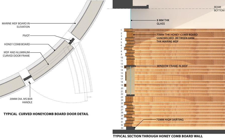 Curved honeycomb board door detail and typical wall section.