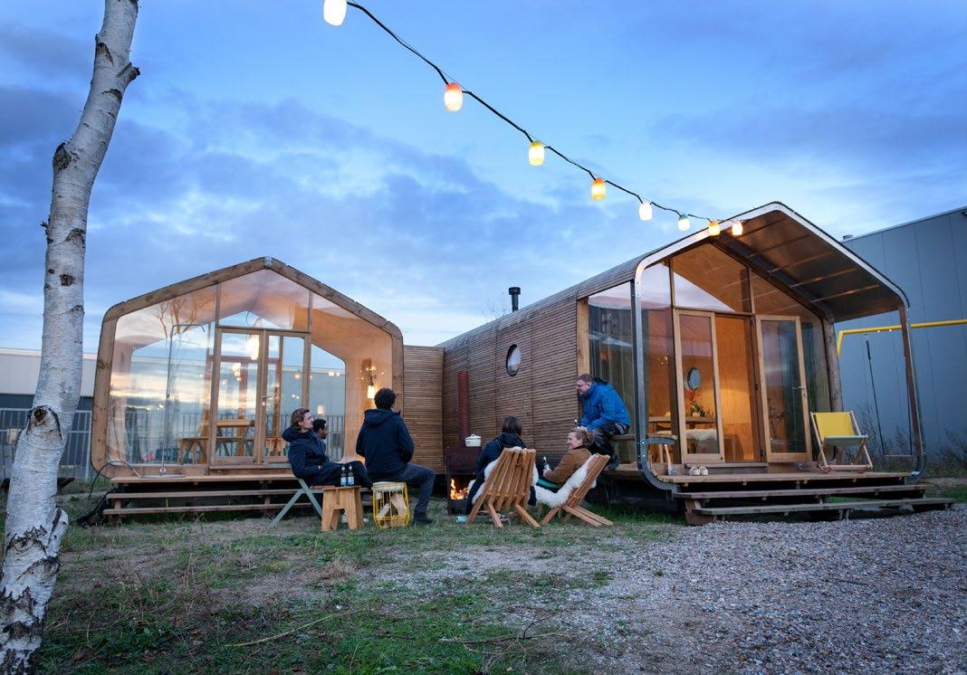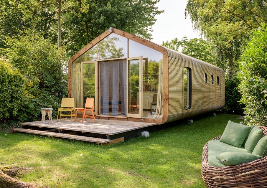 in 2012. Since then, Fiction Factory has continued to develop and market the Wikkelhouse concept at its production site in Amsterdam for permanent residential use. In practice, this means that the house is mainly used as a holiday home. Originally mounted on a truck, the winding machine now stands in a production hall, enabling higher produc tion rates and fast prefabrication of the individual elements.
