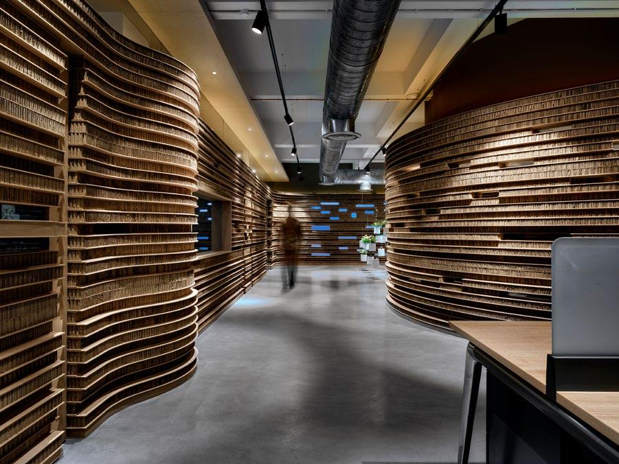 an unconventional office space. The free-flowing cardboard walls create textured partitions that envelope the work stations, conference zones and lounges. Curving cardboard elements create wall sections that billow into the room or wrap around columns. In some areas, the cardboard sheets‘ exterior has been cut away to reveal the internal