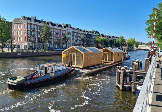 The Wikkelhouse is manufactured in segments and assembled on site (above). It can also function as a floating holiday home, shown here duringtransport and at its anchorage in the port of Rotterdam.