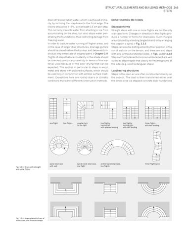 STRUCTURAL ELEMENTS AND BUILDING METHODS 245 STEPS drain off precipitation water, which is achieved primarily by inclining the step towards the front edge. The incline should be 1–3%, but at least 0.5 cm per step. This not only prevents water from standing or ice from accumulating on the step, but also stops water penetrating the foundations, thus restricting damage from freezing water. In order to capture water running off higher areas, and in the case of longer stair structures, drainage gutters should be placed before the top step, and below each individual step in the case of stepped paths. > Chapter 3.11 Flights of steps that are constantly in the shade should be checked particularly carefully in terms of the material used because of the poor drying that can be expected. This applies in particular to steps in wood, metal and stone with polished surfaces, which should be used only in conjunction with antislip surface treatment. Exceptions here are roofed stairs or climatic conditions that admit different construction methods.