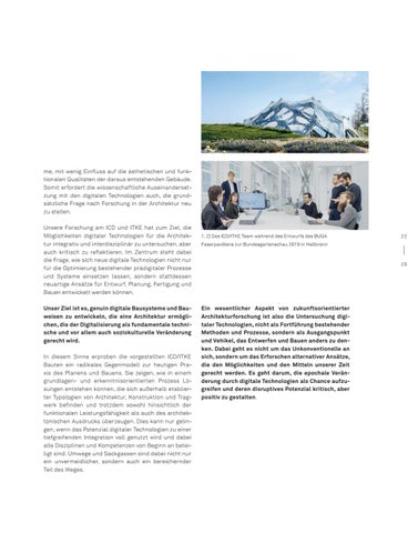 me, mit wenig Einfluss auf die ästhetischen und funktionalen Qualitäten der daraus entstehenden Gebäude. Somit erfordert die wissenschaftliche Auseinandersetzung mit den digitalen Technologien auch, die grundsätzliche Frage nach Forschung in der Architektur neu zu stellen. Unsere Forschung am ICD und ITKE hat zum Ziel, die Möglichkeiten digitaler Technologien für die Architektur integrativ und interdisziplinär zu untersuchen, aber auch kritisch zu reflektieren. Im Zentrum steht dabei die Frage, wie sich neue digitale Technologien nicht nur für die Optimierung bestehender prädigitaler Prozesse und Systeme einsetzen lassen, sondern stattdessen neuartige Ansätze für Entwurf, Planung, Fertigung und Bauen entwickelt werden können. Unser Ziel ist es, genuin digitale Bausysteme und Bauweisen zu entwickeln, die eine Architektur ermöglichen, die der Digitalisierung als fundamentale technische und vor allem auch soziokulturelle Veränderung gerecht wird. In diesem Sinne erproben die vorgestellten ICD/ITKE Bauten ein radikales Gegenmodell zur heutigen Praxis des Planens und Bauens. Sie zeigen, wie in einem grundlagen- und erkenntnisorientierten Prozess Lösungen entstehen können, die sich außerhalb etablierter Typologien von Architektur, Konstruktion und Tragwerk befinden und trotzdem sowohl hinsichtlich der funktionalen Leistungsfähigkeit als auch des architektonischen Ausdrucks überzeugen. Dies kann nur gelingen, wenn das Potenzial digitaler Technologien zu einer tiefgreifenden Integration voll genutzt wird und dabei alle Disziplinen und Kompetenzen von Beginn an beteiligt sind. Umwege und Sackgassen sind dabei nicht nur ein unvermeidlicher, sondern auch ein bereichernder Teil des Weges.