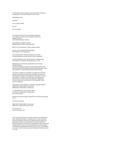 Translation from German into English (chapters by Leydecker, Wachs, Catoir, Ippolito, Blaschitz, Stumpf, Welter): Julian Reisenberger, Weimar Copyediting of English version: Raymond Peat, Alford, Aberdeenshire Editor for the Publisher: Andreas Müller, Berlin Layout, cover design and typography: Rein Steger, Proxi, Barcelona Cover illustration: Translucent back-lit concrete (manufactured by Lucem); photo: Sylvia Leydecker A CIP catalogue record for this book is available from the Library of Congress, Washington D.C., USA. Bibliographic information published by the German National Library: The German National Library lists this publication in the Deutsche Nationalbibliografie; detailed bibliographic data are available on the Internet at http://dnb.d-nb.de. This work is subject to copyright. All rights are reserved, whether the whole or part of the material is concerned, specifically the rights of translation, reprinting, re-use of illustrations, recitation, broadcasting, reproduction on microfilms or in other ways, and storage in databases. For any kind of use, permission of the copyright owner must be obtained. This book is also available in a German language edition (ISBN 978-3-0346-1579-2 hardcover, ISBN 978-3-0346-1300-2 softcover) © 2013 Birkhäuser Verlag GmbH, Basel P.O. Box 44, 4009 Basel, Switzerland Part of De Gruyter Printed on acid-free paper produced from chlorine-free pulp. TCF ∞ Printed in Germany ISBN 978-3-0346-0680-6 hardcover ISBN 978-3-0346-1302-6 softcover 987654321 www.birkhauser.com