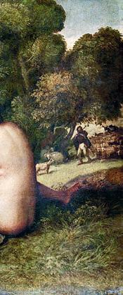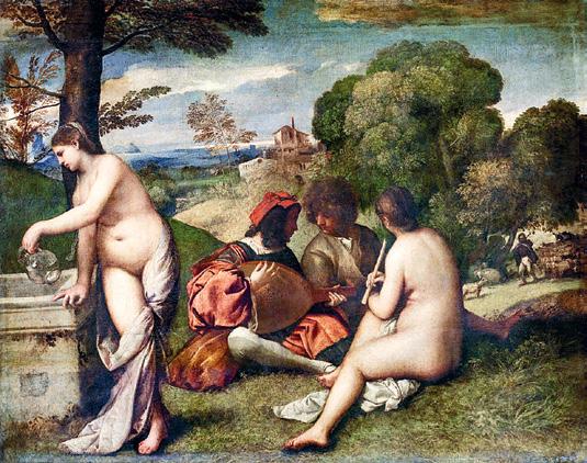 F. 3 The Pastoral Concert, Giorgione and/or his disciple Titian, 1509–1510. Merged with the trees, the shepherd has become part of the landscape.