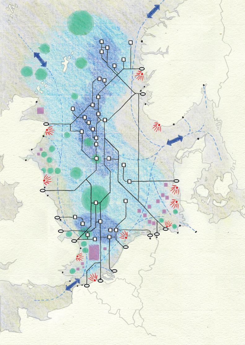 nodes. It is mostly invisible and kept out of sight from the recreational and contemplative “visual” seascape and served either by permanently moving vessels or undersea conduits.