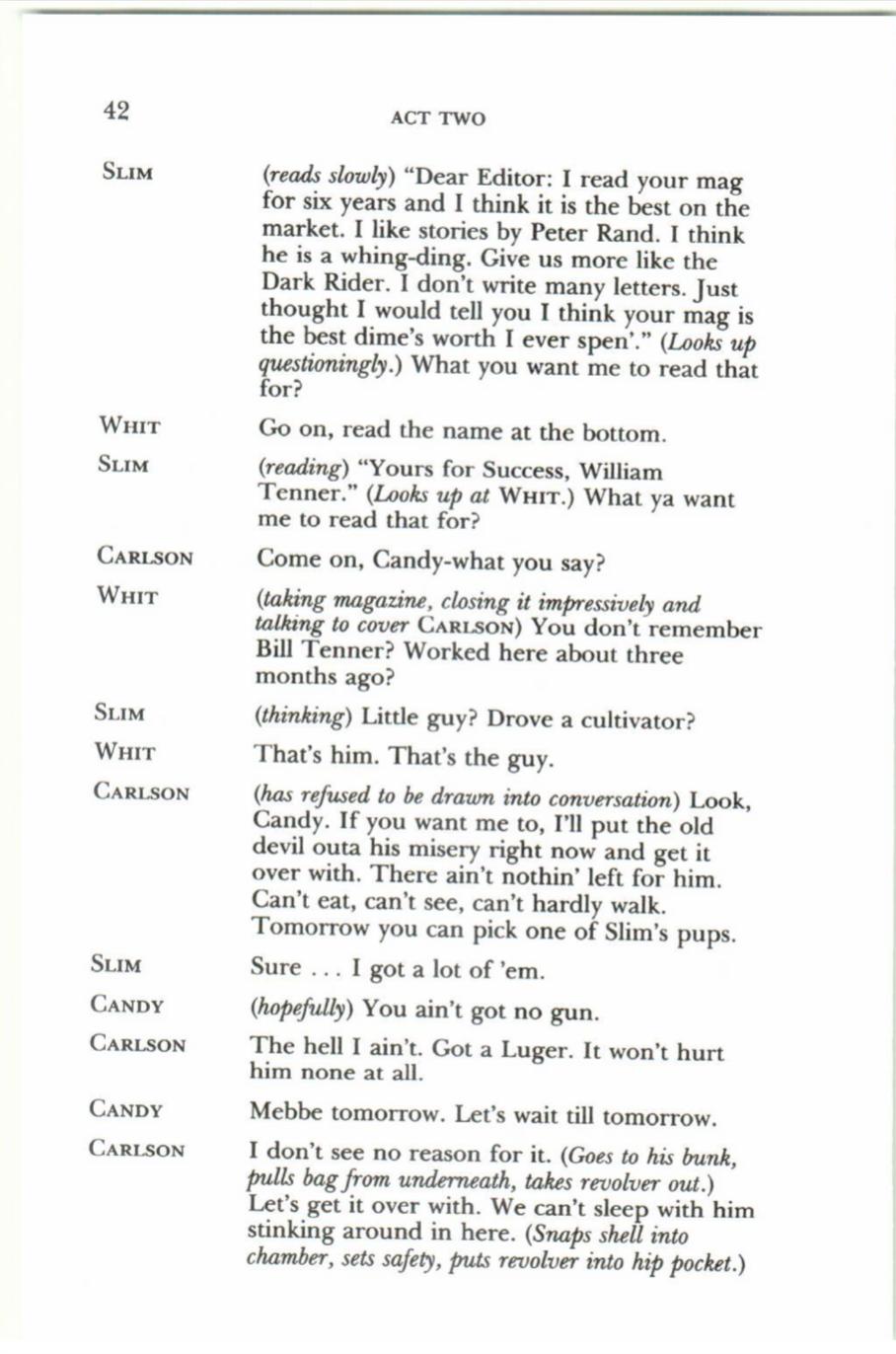 Many of the characters we meet in the play are lonely and crave friendship: Candy’s dog has died, Curley’s wife is lonely in her marriage to her abusive husband, and Crooks is left isolated from the other farm hands because of the colour of his skin George and Lennie’s friendship is therefore rare The two have a sense of connection with each other despite their marked difference in stature and intellect and, while the other characters may feel alone, they have each other to rely on. Even in their final, tragic moments together, George wants to protect Lennie from the baying lynch mob Out of kindness and loyalty to his friend, who would surely have suffered a painful and horrific death otherwise, George chooses to shoot Lennie in the back of the head as he describes for him the homestead the two of them had imagined owning together.
