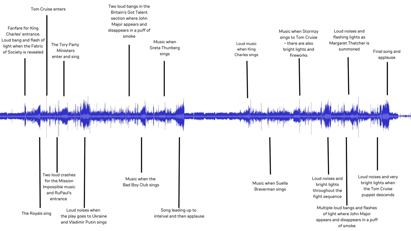 RuPaul and Tom Cruise see a group of Tory Ministers, including Prime Minister Rishi Sunak, Jacob Rees-Mogg, Priti Patel and Suella Braverman, outside Number 10 Downing Street. Some of the Tory Minsters arrive on stage via the auditorium aisles.