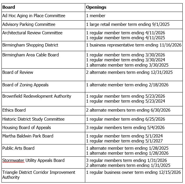 The City of Birmingham is looking for dedicated individuals who want to give back to their community by serving on one of our many boards or commissions. Birmingham’s boards and commissions make recommendations that shape the City’s future. Serving on a board or commission is a great way to get involved in your community, meet new people and make a positive impact. Don't miss out on the chance to make a difference. Visit www.bhamgov.org/boardopportunities to view all the available openings and apply.